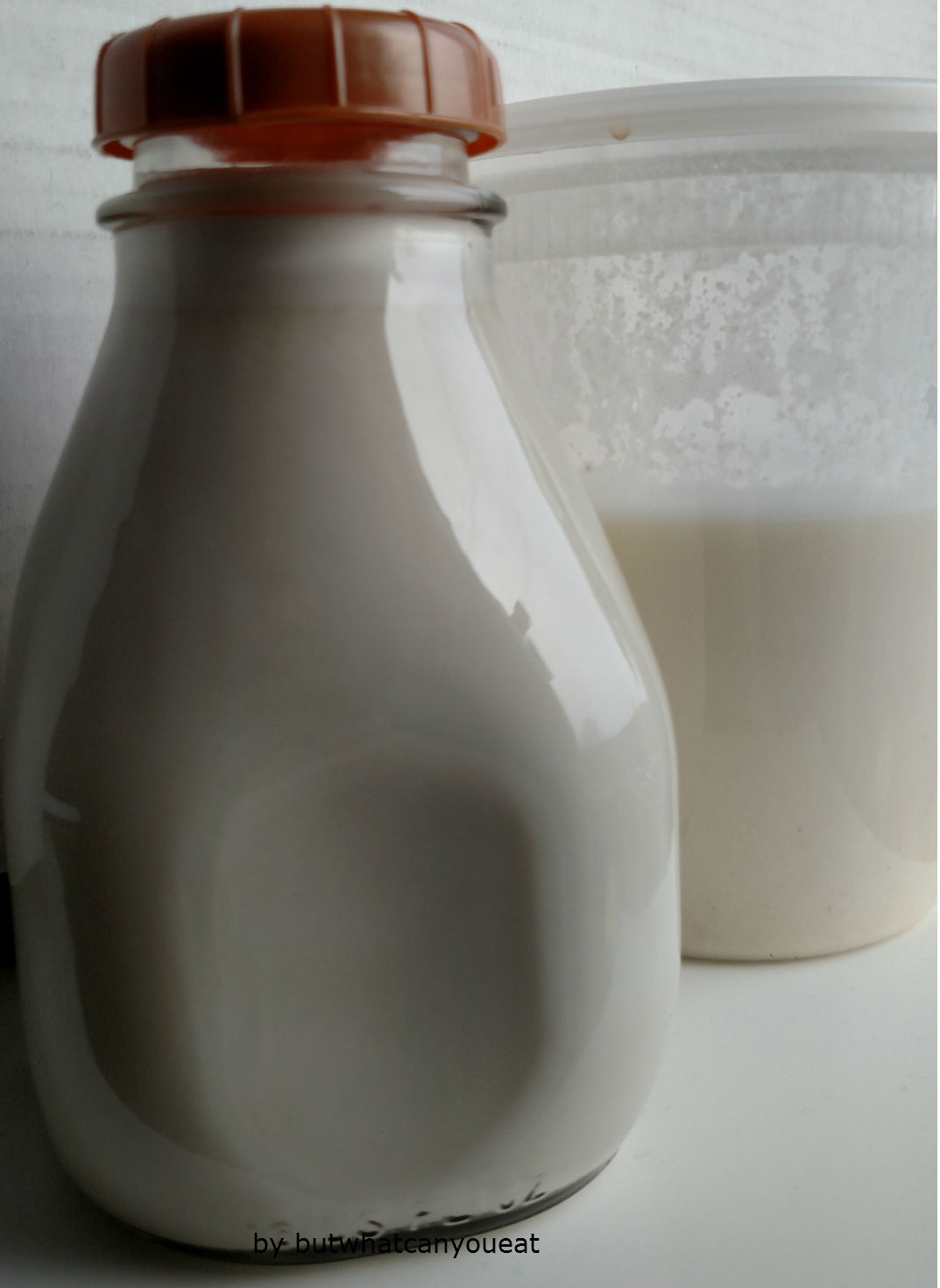 Add the last cup of blitzed cashews into your bowl or jug, and then mix in the last two cups of water. I think this has the texture of a higher fat milk, but I honestly don’t remember what milk tastes like, so your mileage may vary. You can make the milk lighter or thicker depending on the amount of water you use in the recipe. This amount lasts me about a week, or week and a half, and I find it easily scalable for when I need more milk in a recipe.